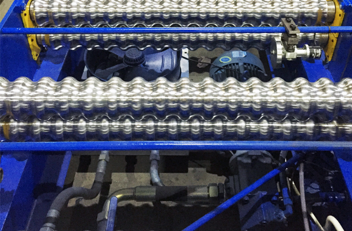 所有滚轮都是整体的通轴经过进口数控车床一次性加工而成,精度高,刚性强,压出来的板平整无痕,速度可达25米每分钟,效率极高。